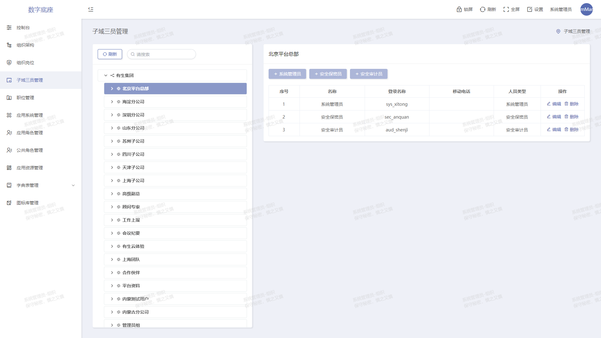 以組織結(jié)構(gòu)和應用授權(quán)為主線,內(nèi)置三員管理、崗位制等功能